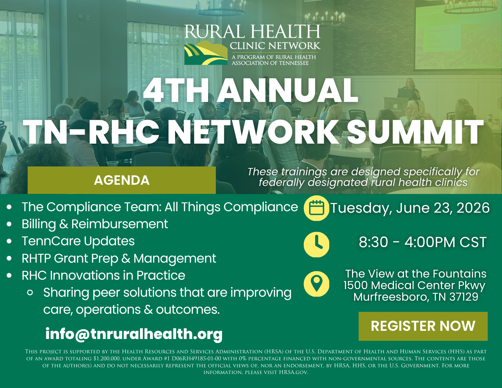 In Tennessee, nearly 22% of the population lives in non-metro areas - most of whom are Medicare and Medicaid patients. Rural Health Clinics are an important part of our healthcare safety net. In fact, nearly 45% of Tennessee's rural communities do not have a hospital or community health center but do have a RHC. The mission of the Rural Health Clinic (RHC) Network is “Improve the health and wellbeing of rural Tennesseans by strengthening and supporting the Rural Health Clinics who serve them.” Managed by Rural Health Association of Tennessee, the RHC Network closely monitors rural policy issues and provide support when changes may affect RHCs. We also provide annual educational workshops to keep RHCs informed of policy changes, billing and coding, evaluation and management. Subscribe to the RHC Newsletter4th Annual TN-RHC Network Summit